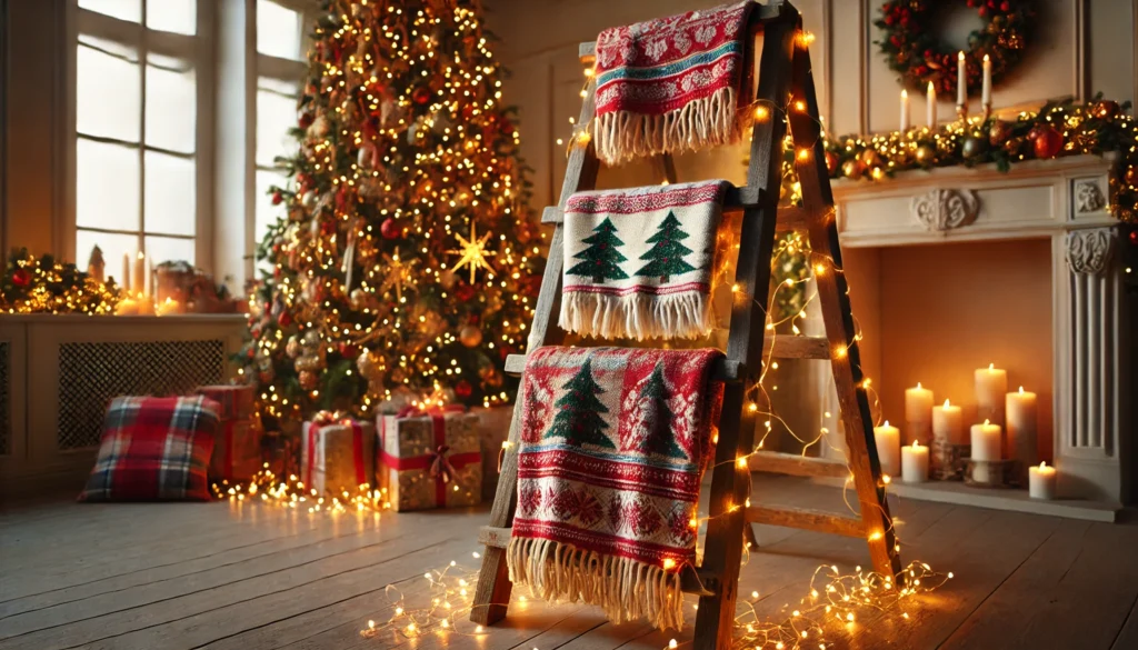 Transform a simple rustic ladder into a charming holiday decor piece by draping it with cozy plaid blankets. Lean the ladder against a wall to create a warm, inviting focal point in your living room, entryway, or bedroom. For a festive touch, hang holiday-themed blankets or throws in complementary colors and patterns, such as red and green plaids or cozy knits with snowflake motifs, on each rung. To elevate the look, wrap the ladder with delicate string lights that cast a warm glow or drape a simple garland of greenery along the sides for a natural touch. This easy yet stylish setup not only adds seasonal warmth to your space but also doubles as a functional way to display your favorite blankets during the colder months.
